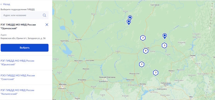 Перед нами появляется карта региона, который мы выбрали ранее. Здесь мы можем выбрать подразделение ГИБДД для записи, как на карте, так и в графе поиска. Находим нужное подразделение и нажимаем «Выбрать».