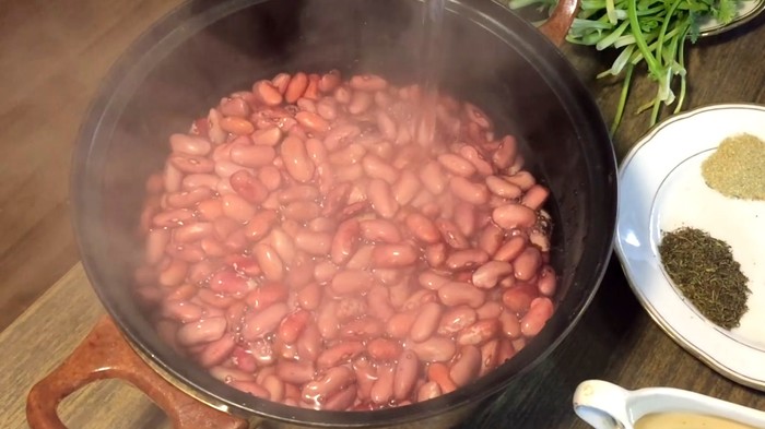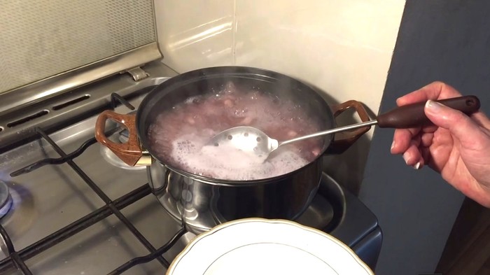 2)утречком сливаем воду, промываем фасоль, наливаем ей чистой водички где-то 1:4-1:5 и варим часа полтора. Алярма: не берите кастрюлю с белым покрытием внутри, может покраситься. Алярма 2: солить не нужно, это ещё увеличит время варки. Алярма 3: когда закипит, оттуда повалит пена. Пену убрать, газ убавить, варить без суеты;