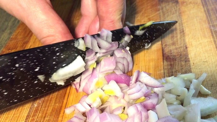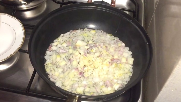2) Луковицу мелко нарезать и выложить в разогретое на сковороде масло, обжарить до мягкости.