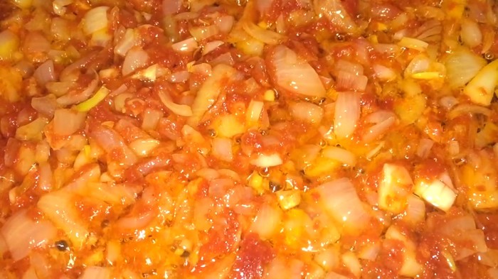 4) где-то за 15-20 минут до готовности фасоли начинаем колдовать. На сковороде разогреть масло, туда лук. Как только подрумянился чутка - туда морковь и немного пожарить с помешиванием. Потом на тёрке туда потереть голую помидорку, кинуть аджику, вяленые томаты и потушить вместе минут 15. А тут и фасоль подоспеет. Алярма: советую брать глубокую сковороду, в ней мешать удобнее;