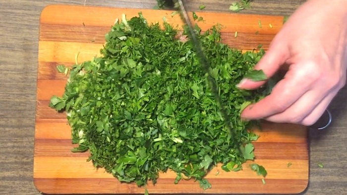 6) Добавить мелко нарезанный чеснок и рубленную зелень, перемешать.