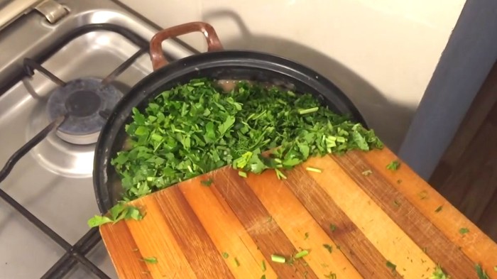 Пока лук и томатная паста тушатся нарезаем зелень: кинзу, петрушку, укроп и сельдерей.