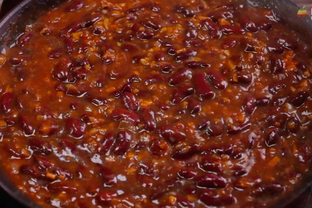 Частично разомять варенную фасоль и добавить тушённый с томатной пастой лук.