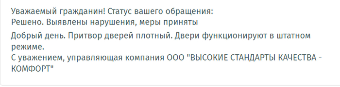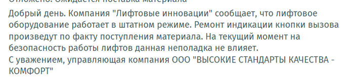 То есть, сделаем когда-нибудь что-нибудь. И вообще - лифт работает в штатном режиме. Отклнонено, поскольку такие ответы приходят постоянно, некоторые вопросы в процессе решения уже по полгода, а тут даже срок решения не указан.