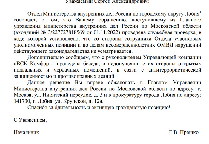 Ну и на это обращение и моё обращение в МВД пришёл один ответ: