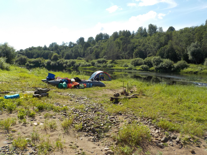 Встали на 26-м км в пойме реки прямо на перекате. Здесь хорошо, что не пришлось затаскивать вещи на высокий берег. Из минусов – эта стоянка предназначена только для хорошей погоды. Если пойдет дождь, ее тут же основательно подтопит. Наверх поднимается тракторная колея от какого-то очень большого трактора основательно размытая дождевыми ручьями. Здесь, похоже, есть тракторный брод. Наверху – хороший смешанный лес, большие березы, есть елки и сосны, между березами – просто трава и редкий кустарник (нет непроходимых зарослей кустарника и крапивы, которые обычно бывают в лиственных лесах).