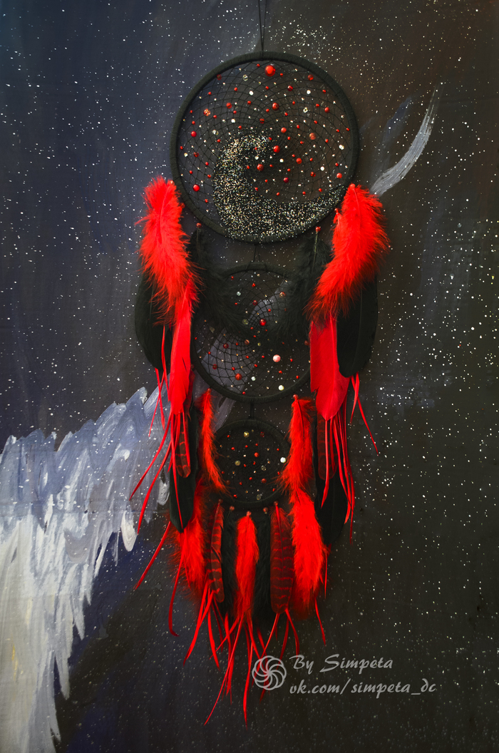 Для сообщества рукодельников: в создании использованы нити, огромная куча бусин и бисера (от матового пластика до кракле, вен дракона и кошачьего глаза), четыре вида окрашенных перьев. Техника плетения - классическая.