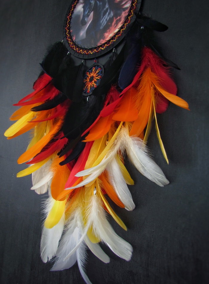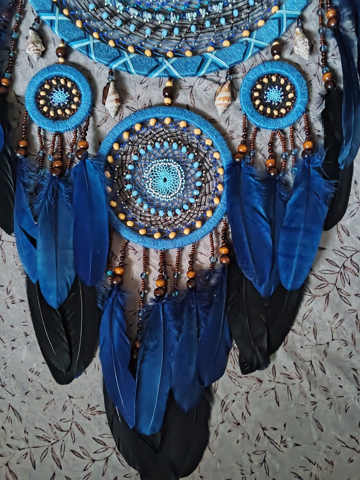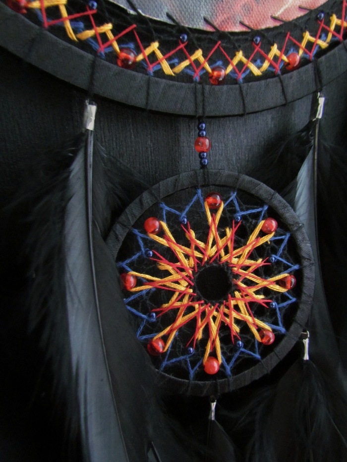 Длина ловца снов 74 сантиметра, диаметр верхнего круга 34 сантиметра. Основа из дерева, обмотка пряжей. Рисунки в центре сделаны вручную, роспись по фетру.