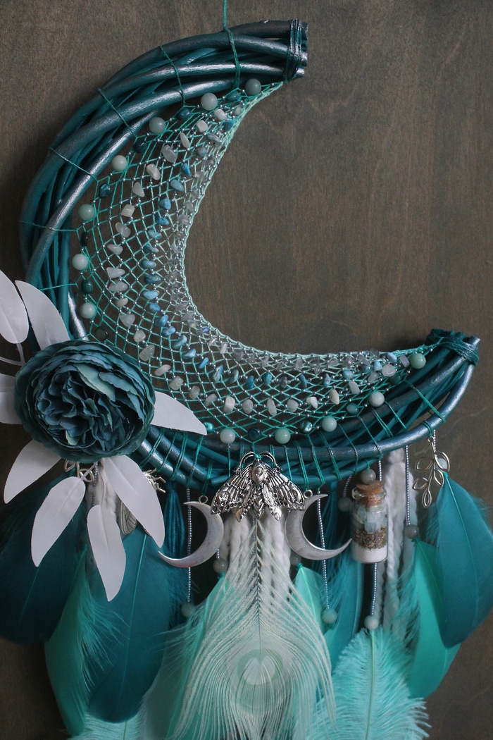 В ловце использованы бусины из натурального граната, бисер и металлическая фурнитура. Перья украшены стразами, я прям полюбила использовать их в своих работах)