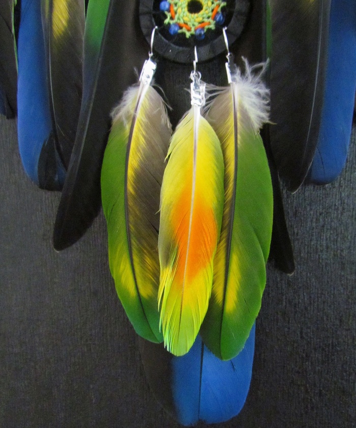 Перья в нем - натуральных цветов от попугаев амазона и ары. Сложно поверить, что это природа их так раскрасила, а не мои краски) соответственно, и плетение тоже пришлось делать ярким под стать перышек