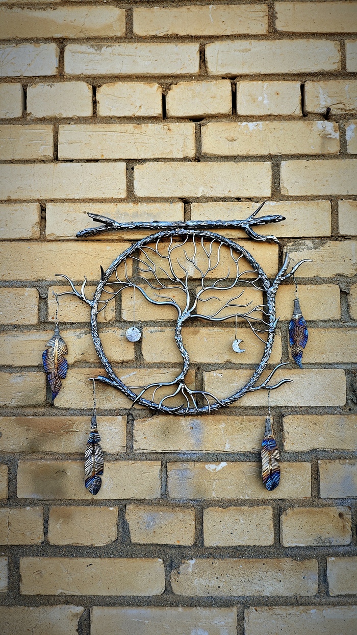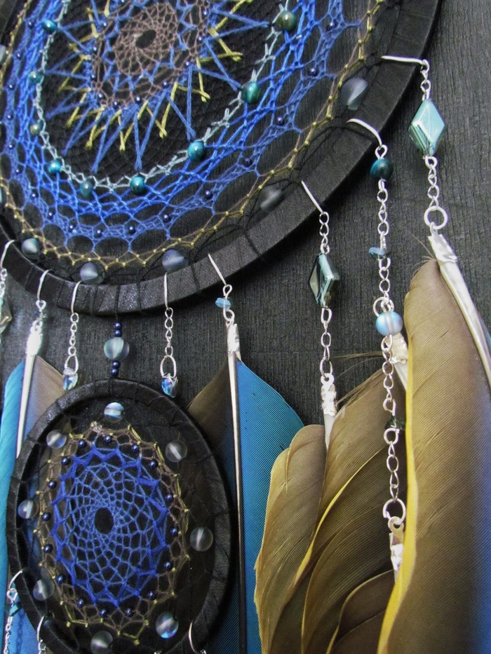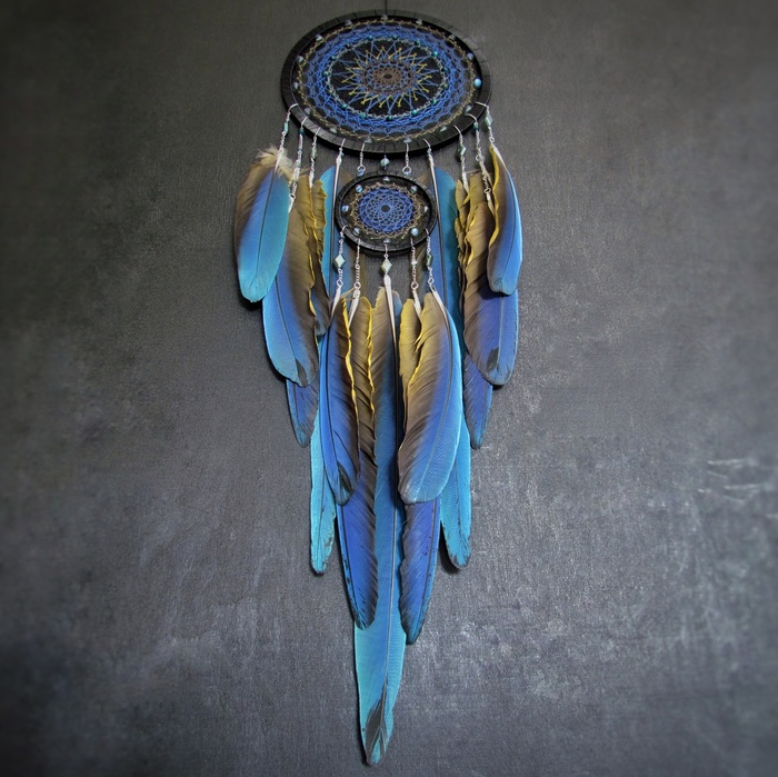 Перья в ловце можно красиво выложить только синей стороной вверх, как на фото, а можно оставить висеть как сами лягут, ориентируясь на свои вкусовые предпочтения.