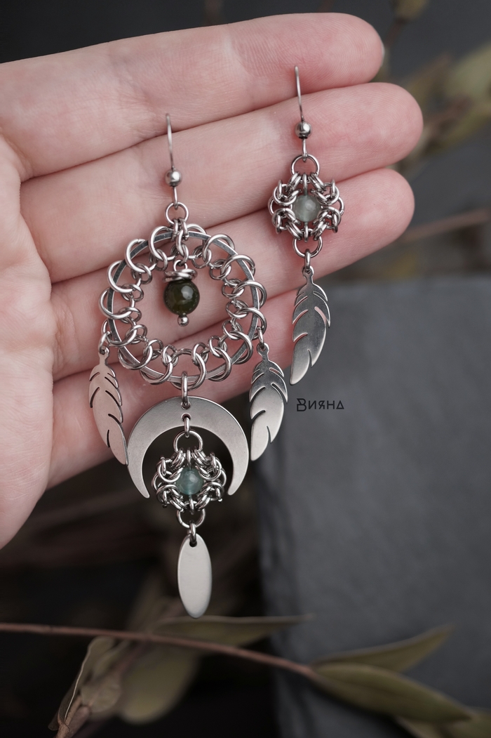Захотелось добавить асимметрии. А ещё мне очень нравятся ловцы снов в кольчужном воплощении. Крупная серёжка слегка звенит при раскачивании.