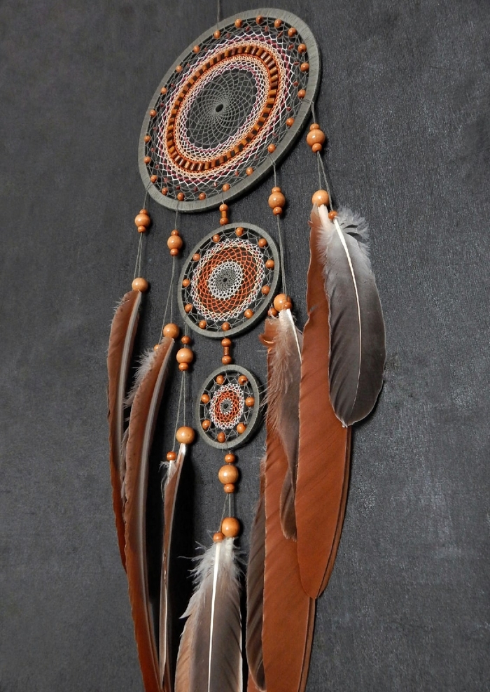 Также в этой работе был запрос на максимальную "натуральность", поэтому использовали деревянные бусины, немного бисера, хлопковые нити и натуральные перья