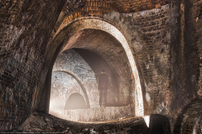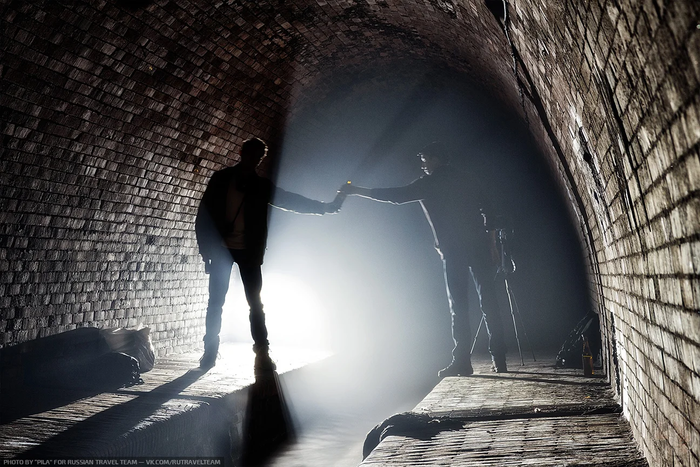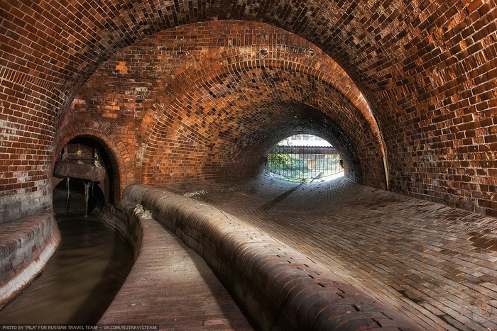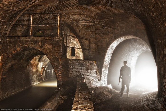 Технология простая. Канализация протекает в левом тоннеле, а правый сухой. Если поднимается уровень воды в следствие сильных дождей и малый коллектор (на фото слева), который отводит стоки на очистные сооружения, не справляется, то воды уходит в реку, а потом и на улицу.