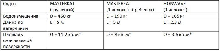 Я буду учитывать три составляющие буксировочного сопротивления: силу трения, силу сопротивления формы и волновое сопротивление. Катамаран я рассчитаю с двумя вариантами загрузки 190 и 450 кг.