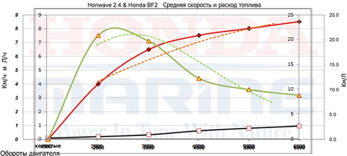 Это график для комплекта лодка HONDA HONWAVE 2.4 + мотор Honda BF 2.3, заимствованный с сайта австралийского представительства Honda, который я уже приводил в начале статьи.
