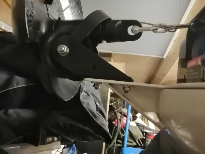 Пилить изделие из стекловолокна-то ещё удовольствие-чесались долго. Плюс были опасения за её прочность и вынос роульса не подходил. Поэтому из металлической пластины изготовлено усиление и роульс установлен на нее. Там же был уставлен рым-утка.