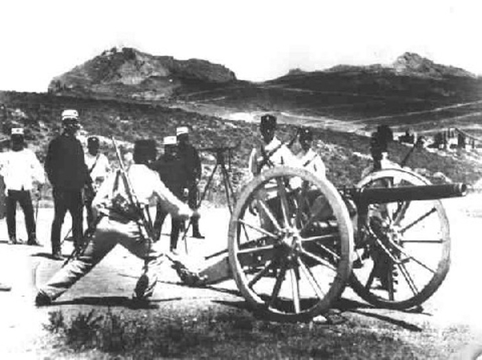 Артиллерия на позициях (похоже, 90-мм орудия Круппа, главная сила греческого "бога войны"):