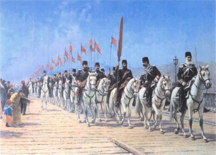 На войну отправляется элитный кавалерийский полк султанской гвардии "Эртугрул", которому вскоре предстоит понести тяжелые потери (картина итал. художника Фаусто Зонаро):