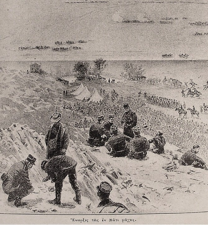 Греческие войска на позициях у Мелуны наблюдают за приближением турецкой армии: