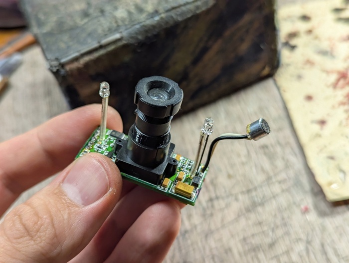 Внутри камеры бутерброд из платы, резьбового крепления и собственно объектива с резьбой 12мм, это стандартный форм-фактор камер видеонаблюдения. Вращением достигается точная фокусировка.