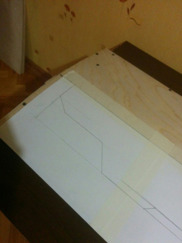 После склеивания бутерброда из 3х слоев фанеры, крепим все это дело к стапелю саморезами. Тут важно соотнести центральные оси склеенной фанеры и самого стапеля. К сожалению, большой фотки, как оно все крепится, у меня нет. Поэтому ниже фотка части фанерного бутерброда, поверх которого с помощью листов а4 и карандаша я набросал примерную форму доски, на стапеле.