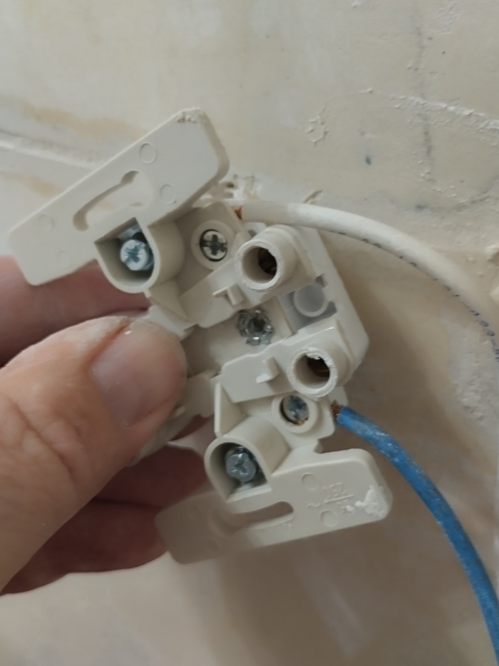 Когда закручивал крепёж розетки, отломился кусок старого подрозетника.