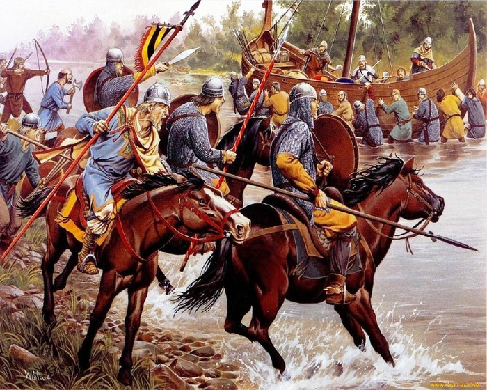 Есть ещё один интересный момент в описании - мол, разгром довершил удар конницы. Вы слышали о грозной викингской кавалерии? Я нет. Предполагаю тут два варианта: или на поле действительно показался конный отряд, который вступил в бой (например разведка на экспроприированных лошадях вернулась), но и тут биться с седла продолжали бы только в случае погони - в спину так рубить даже удобнее. В сражении против организованного строя скандинавы бы спешились. Ну или второй вариант: появление пугающей "конницы" приписали позднее, дабы хоть как-то объяснить разгром - во франкских землях и иже с ними это был весомый аргумент.