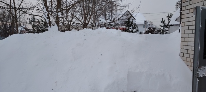 У меня последний гараж в ряду, поэтому чистить снег не сложно, не нужно увозить на санках, как это делают владельцы гаражей в середине. За эти два снегопада нападало столько снега, что кидать его уже тяжело стало, горка образовалась около двух метров.