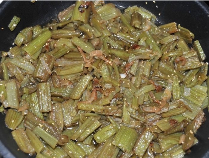 На Сахалине первый раз попробовала салат из лопуха по-корейски. Делают его из молодых лопушков, лист не употребляют в пищу, только ствол.