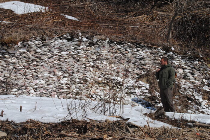 Автор и завалы раковин гребешка на острове Кунашир – просто для представления масштабов