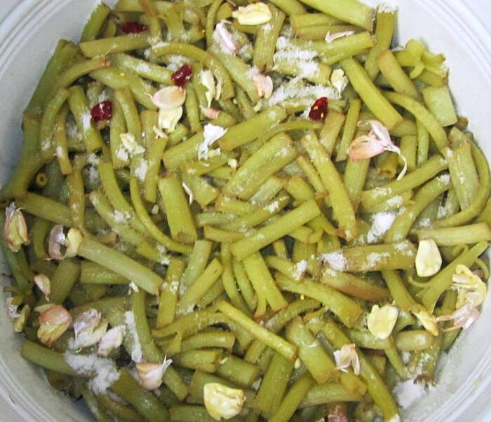 Пока лопух стоит на огне, приготовим специи. Чеснок очищаем от тонкой шелухи, но не чистим, как обычно, а вместе со скорлупками давим ножом или камнем. Точно так же разминаем красный сушенный перец. Свежий не подойдет. Затем выбираем дуршлагом содержимое кастрюли, выкладываем на стол, даем стечь воде и немного остыть. Последний этап - все складываем в большую емкость слоями, пересыпая каждый слой, солью, чесноком и перцем. Пропорций не даю, ориентироваться надо на свой вкус. Заливаем водой так, чтобы не до края, накрываем куском белой ткани и ставим сверху гнет. Закисляться все это добро будет не менее 4-5 дней. Потом можно разложить в банки, простерилизовать и закатать крышками. А можно оставить в той же емкости, если позволяет температура помещения. Только надо периодически прополаскивать ткань от накопившейся плесени.
