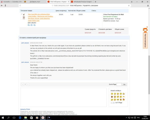 Халява на Али работает. Не ожидал, что что-то там получу. Но, в итоге, выиграл лосьон для тела. Сообщение об этом пришло 9 мая. Раньше не писал, т.к. ждал когда приедет. Лосьон благополучно был отдан жене.