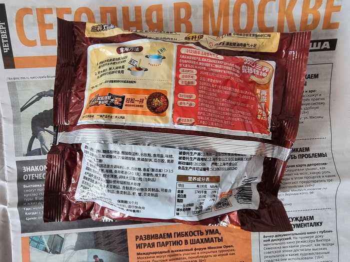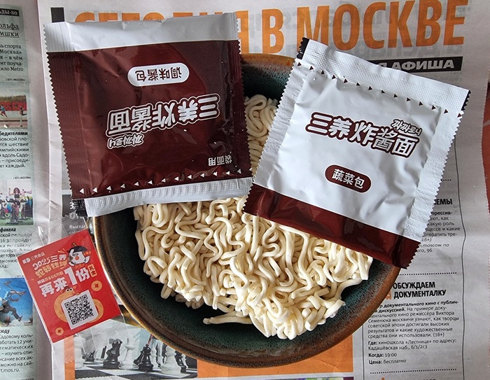 Лапша круглая, значительно более светлого оттенка, чем обычно приходится видеть, и более широкая. Запах стандартный для китайской лапши. Также здесь есть два пакета - в одном сухие добавки (в основном капуста и морковь, горошек мне не положили, а жаль, зато положили прилично соевого текстурата), в другом тот самый тёмный соус. А ещё я нашёл маленький кусочек яркого картона, также запечатанный в целлофан (ох и любят китайцы всё запечатывать). Оказалось, что это лотерейный билет, и по нему можно выиграть приз стоимостью от 0,2 до 26 юаней - удивительная щедрость, конечно. Узнать, выиграл ли мой билетик, мне, увы, не удалось - при сканировании куар-кода мне предложили авторизоваться через WeChat, да ещё впридачу выяснилось, что розыгрыш закончился ещё в марте.