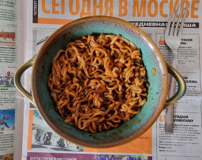 Штош. У нас получилась небольшая порция симпатично чумазой лапши с редкими вкраплениями овощей и сои, призванной имитировать мясо. Пахнет неплохо - в основном всё тем же соевым соусом, текстура маслянистая, остроты - ноль, соли тоже мне показалось маловато. Лапша классная, в меру упругая, вкус в целом приятный, с оттенками соевого соуса и каких-то пряностей. Изначально порция мне показалась маленькой, но через некоторое время я понял, что наелся - это довольно сытная лапша.