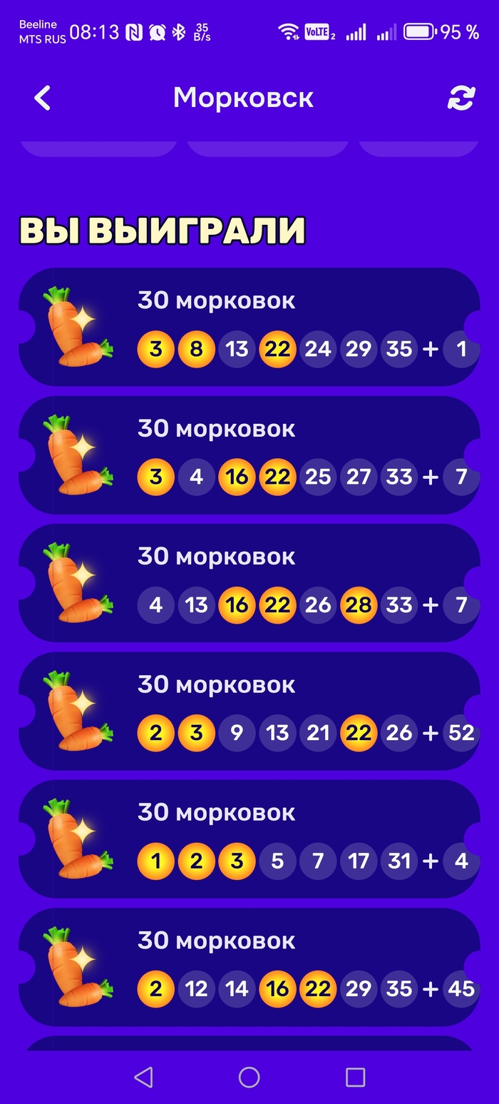 Из 84 билетов выиграл только 700 морковок. На них купил новые билеты и о чудо! Победа!