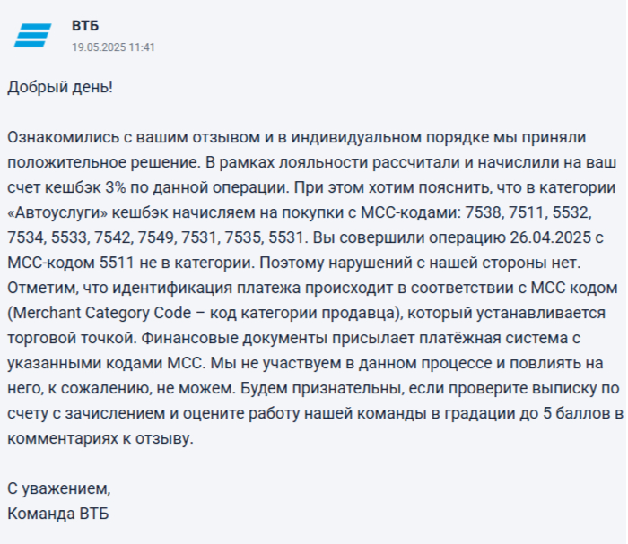 Выбрал в апреле категорию кэшбэка "Автоуслуги" — логично, ведь планировал ремонт у официального дилера. 26 апреля оплатил ремонт машины на 18 955, а транзакция прошла с кодом MCC 5511 (продажа, сервис, ремонт, запчасти и лизинг легкового и грузового транспорта). Казалось бы, всё ОК, но в банке ВТБ этот код относится только к продаже авто.