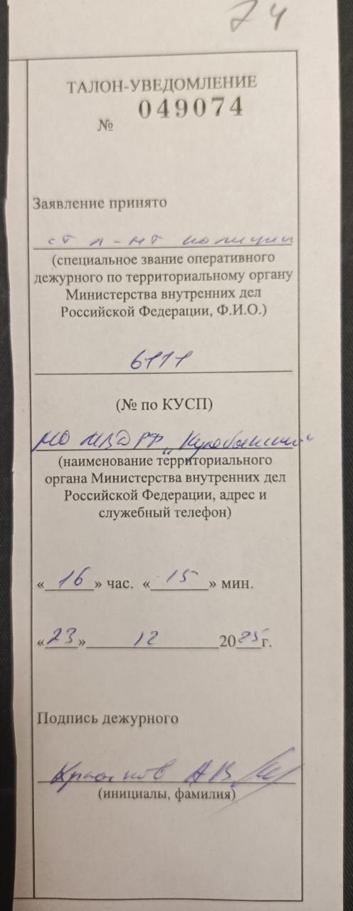 Заявление написано, талон КУСП на руках. [ниже в теле письма]