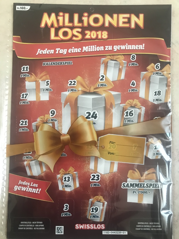 А сегодня за 6000 рублей я купила мужу вместо рождественского календаря с шоколадками, лотерейку. Купила не потому что денег не считаем, а потому что для него это очень важно. Эта игра стала традицией во многих семьях, проводят ее каждый декабрь с 1999 года. Каждый день открываешь окошечко и возможно, станешь одним из 24 миллионеров или какой-то небольшой выигрыш. Всего разыгрывают 47 млн франков - это более 3 миллиардов рублей, КАРЛ, 3!