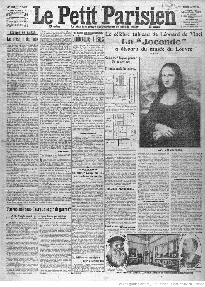 Все два года активных поисков «Джоконда» не сходила с передовиц французских изданий. Особенно усердствовала парижская газета Le Petit Parisien, которая ровно месяц украшала каждый свой выпуск изображением картины. С каждым днем известность картины росла и очень скоро во Франции не осталось людей, которые не слыхали бы о громкой краже из Лувра. Так как следствие топталось на месте и журналистам писать было особо нечего, они начали разбирать полотно Леонардо «по винтикам» и скоро буквально все газетчики превратились в экспертов в области живописи. В газетных статья обсуждалась форма мазков великого мастера, игра теней на заднем плане, прямоугольная композиция и множество других деталей, ранее известных лишь живописцам и реставраторам.
