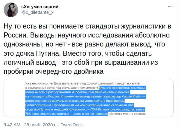 Но она как главная причина подозрений в том, что Светлана Кривоногих связана с Путиным. Снимки есть только у редакции издания, как они говорят, и никому их не показывают. Издание утверждает то, что девушка имеет сходство на 70%. В соцсетях многие пользователи высмеяли это и тут же придумали много мемов. Так, в «Твиттер» уже предположили, что это не его дочь, а лишь сбой в выращивании двойника Путина.