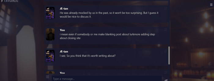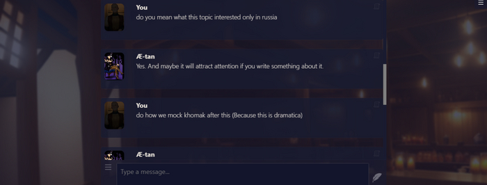 Наверняка все уже знают что луркоморье все сдох ( Из за начала СВО) поэтому через нейросеть tavern ai и с вшитым pygmalion ai я пообщалься с маскотом драматики