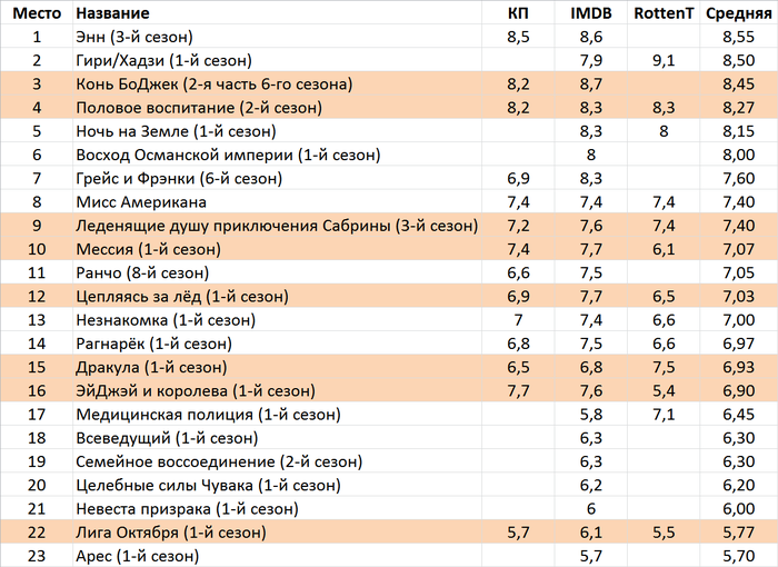 Таблица с рейтингами Кинопоиска, IMDB и Rottentomatoes. Красным выделены сериалы с лицензионной русской озвучкой.