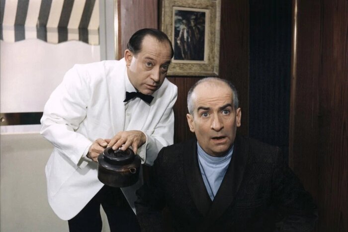 Великий комик в легкую объединял разные эмоции с итоговым удивлением и бурным всплеском недовольства. Сцены со слугой при всей своей эпизодичности максимально насыщены комедийной составляющей и различными отслылками к классике. Так в дань немому кино и Бастеру Китону сняли сцену с пролитым кипятком на ноги разъяренного промышленника. Импровизации Луи со случайными действиями часто становились частью сюжета. Так во время недовольной передачи сахара Мартену, один из кусочков выпадает на стол. Реакция на происки конкурента так же была придумана Луи - надменная улыбочка, руки в боки с морганием.