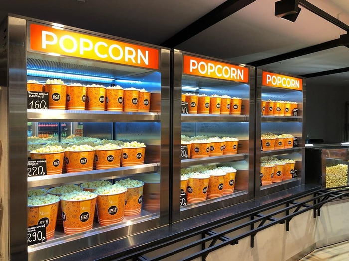 Первое, что неприятно удивило, это невозможность нормально насыпать себе попкорн и налить колу. Огромный зал самообслуживания, на витринах выставлены корзины с попкорном разных вкусов: ириски, сыр, трюфель, но нет обычного соленого, все они в огромных корзинах, которых за 2 часа не съешь. Персонала в зале как будто бы много, но все они бегают туда-сюда, просто насыпать при тебе нужный горяченький баскет никто не может/не хочет, берите с витрины. Если нужного вкуса нет, ну штош, в следующий раз значит.