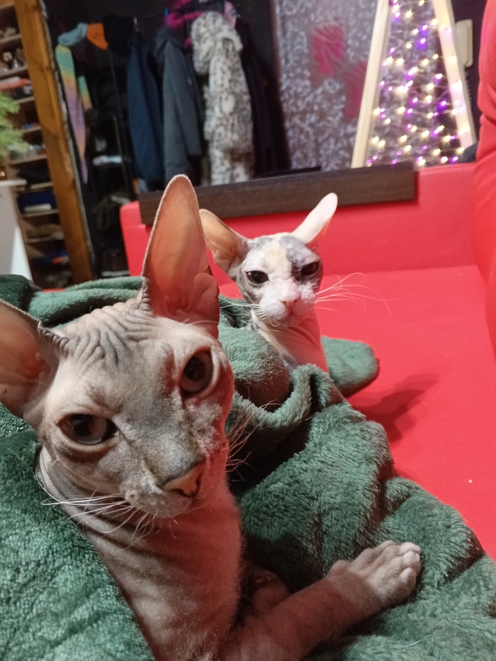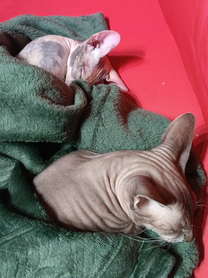 Лысьва крупнее Чучи. И упитанее. И совершенно не такой ласковый ангел. Поэтому Чученьке от неё часто люлей прилетает. Чуча расстраивается и идёт есть. Но не в сфинкса корм.