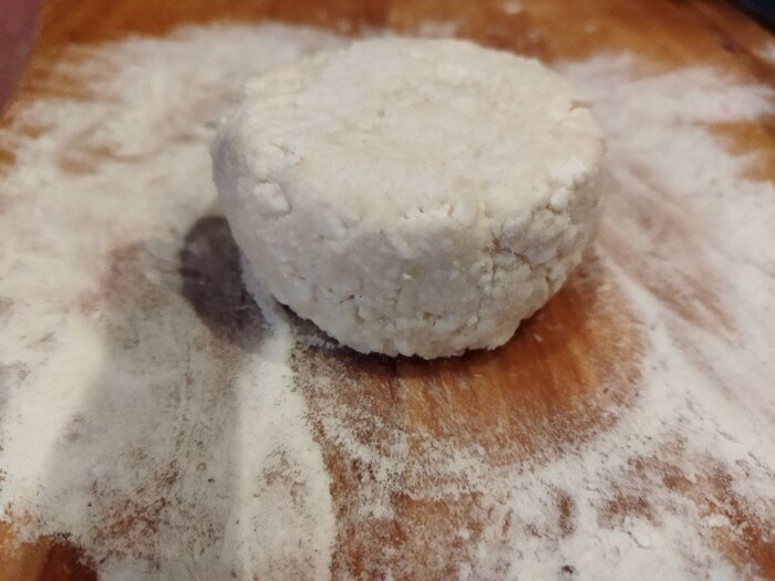 Основа готова, переходим к формированию, подпыляем доску, сковородку на разогрев, бросаем кусочек сливочного.