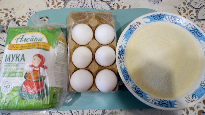 Яйца 2 шт,мука высший сорт 400гр,манка 400гр,творог 400гр,сахар 100гр. Творога было больше,чем 400гр,так что все пропорции увеличил.Первые три наименования купил по дороге с работы,благо локдаун не коснулся магазинов продуктов питания.