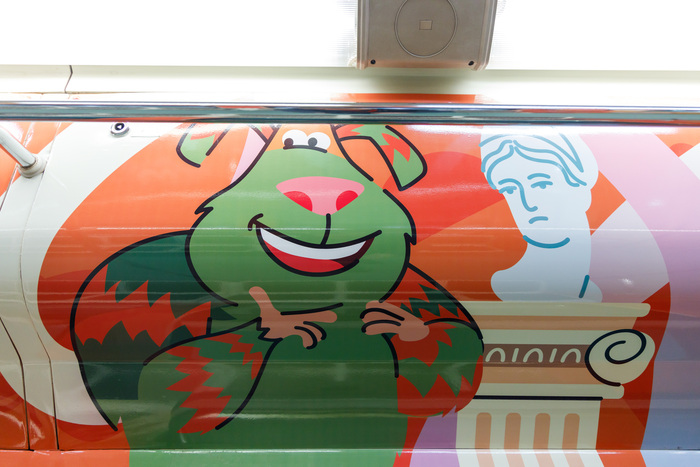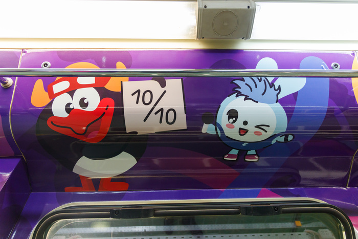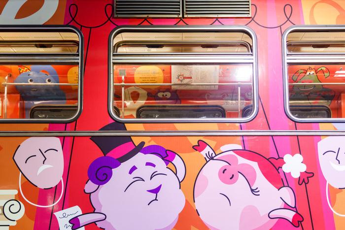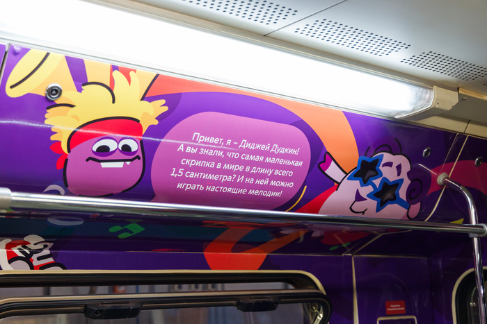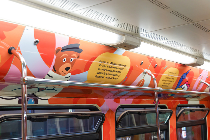 Каждый вагон состава оформлен яркими иллюстрациями, на которых персонажи знакомят пассажиров с интересными фактами из мира науки, экологии, музыки, искусства и географии.