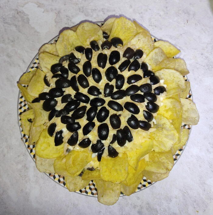Салат отправляем в холодильник на 1 час чтобы пропитался, а перед подачей украшаем по кругу чипсами в два ряда, сверху делаем семечки из маслины.